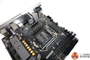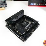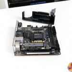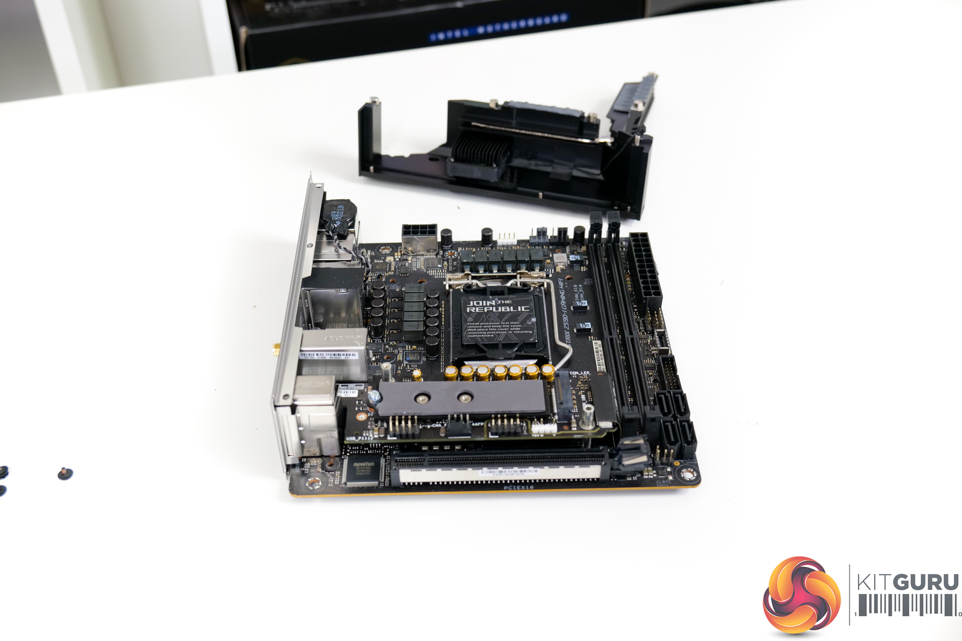 ASUS deploys a commendable heatsink design for the ITX motherboard. The heatsink is dense and reasonably heavy, the screw-down installation is high pressure and makes good contact between the thermal pads and VRM components, and you also get a heatpipe connecting both individual metal cooling blocks. Housed on the left-side heatsink-come-rear-IO-cover is a 30mm VRM fan. This has its own dedicated speed control header and pushes air through a small set of metal fins. Grills above the fan on the rear IO cover allow for airflow access.