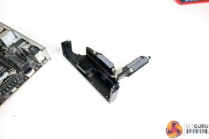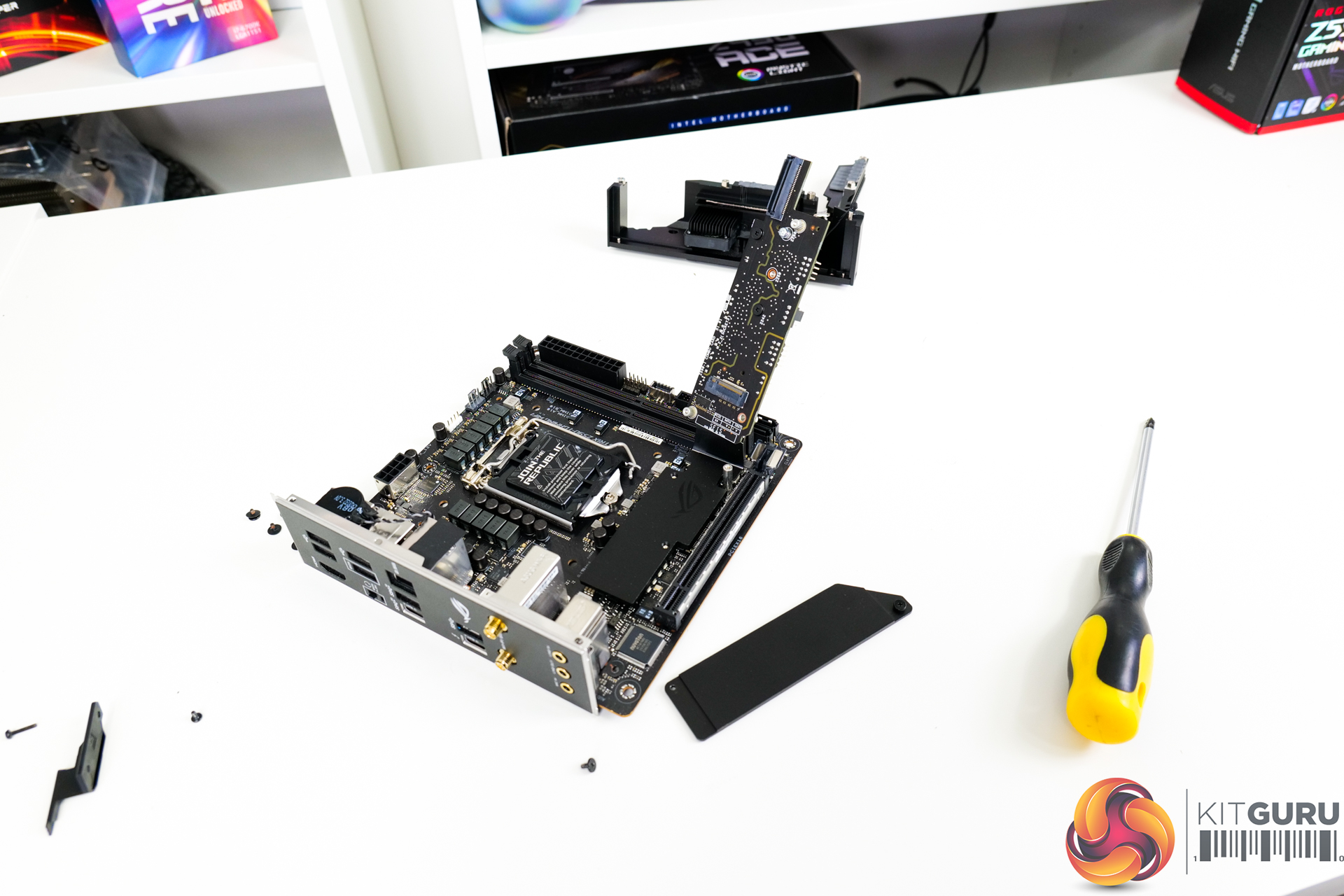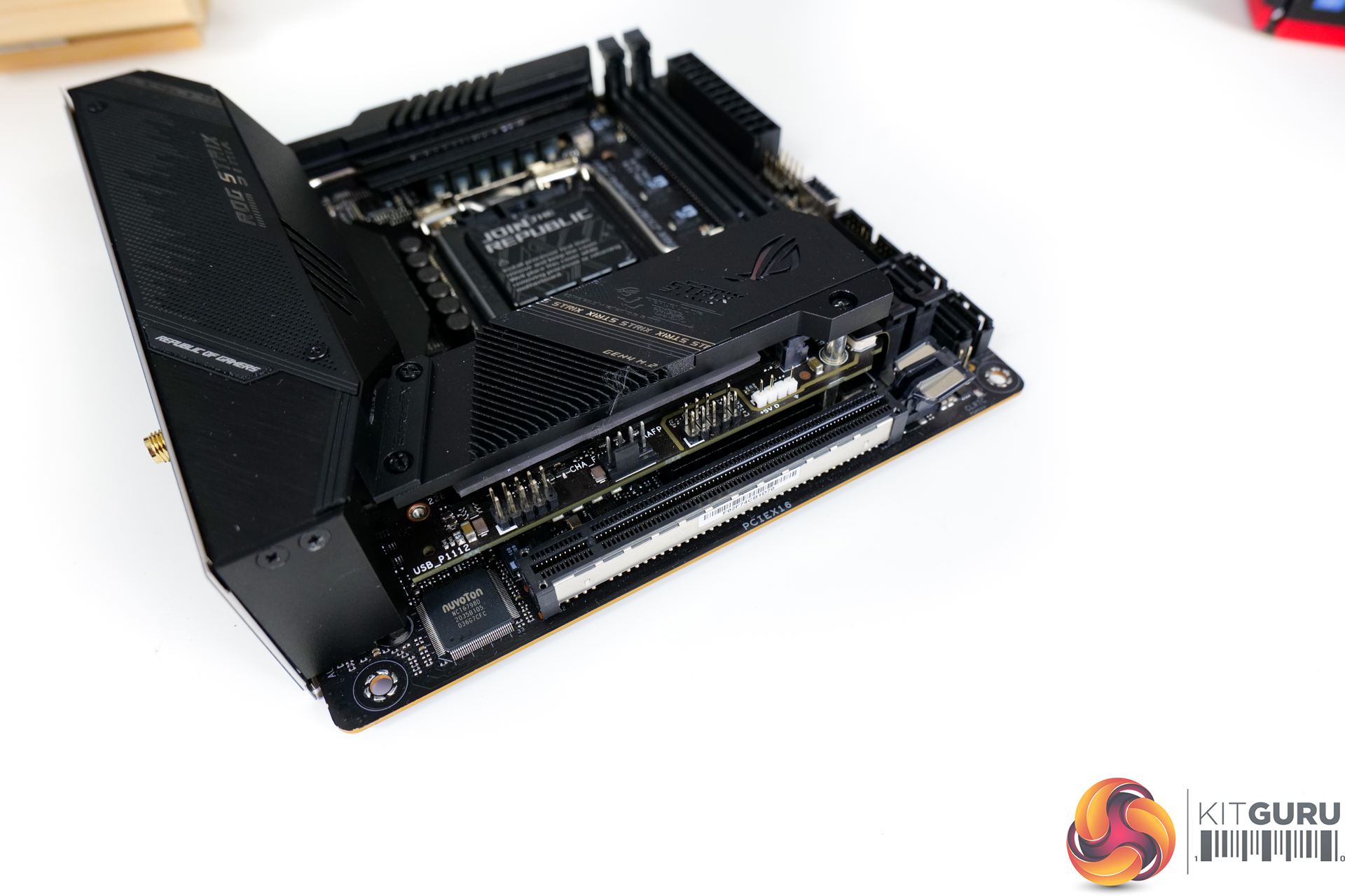 ASUS' daughterboard provides a top M.2 slot and an underneath M.2 slot in a double-stacked design. This is arguably better than the one front and one rear approach of other ITX motherboards, as both M.2 SSDs are cooled by ASUS’ metal heat strips and thermal pads. I thought M.2 accessibility would be better, but this is not the case; it was easier for the VRM heatsink to be taken off in order to access the underneath SSD slot for my sample.