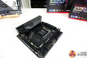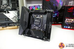 The ROG STRIX Z590-I Gaming WiFi uses a largely black and grey styling that look good overall with no obnoxious features. ASUS minimises the use of large, overpowering components that can cause interference headaches, except the M.2 daughterboard.
