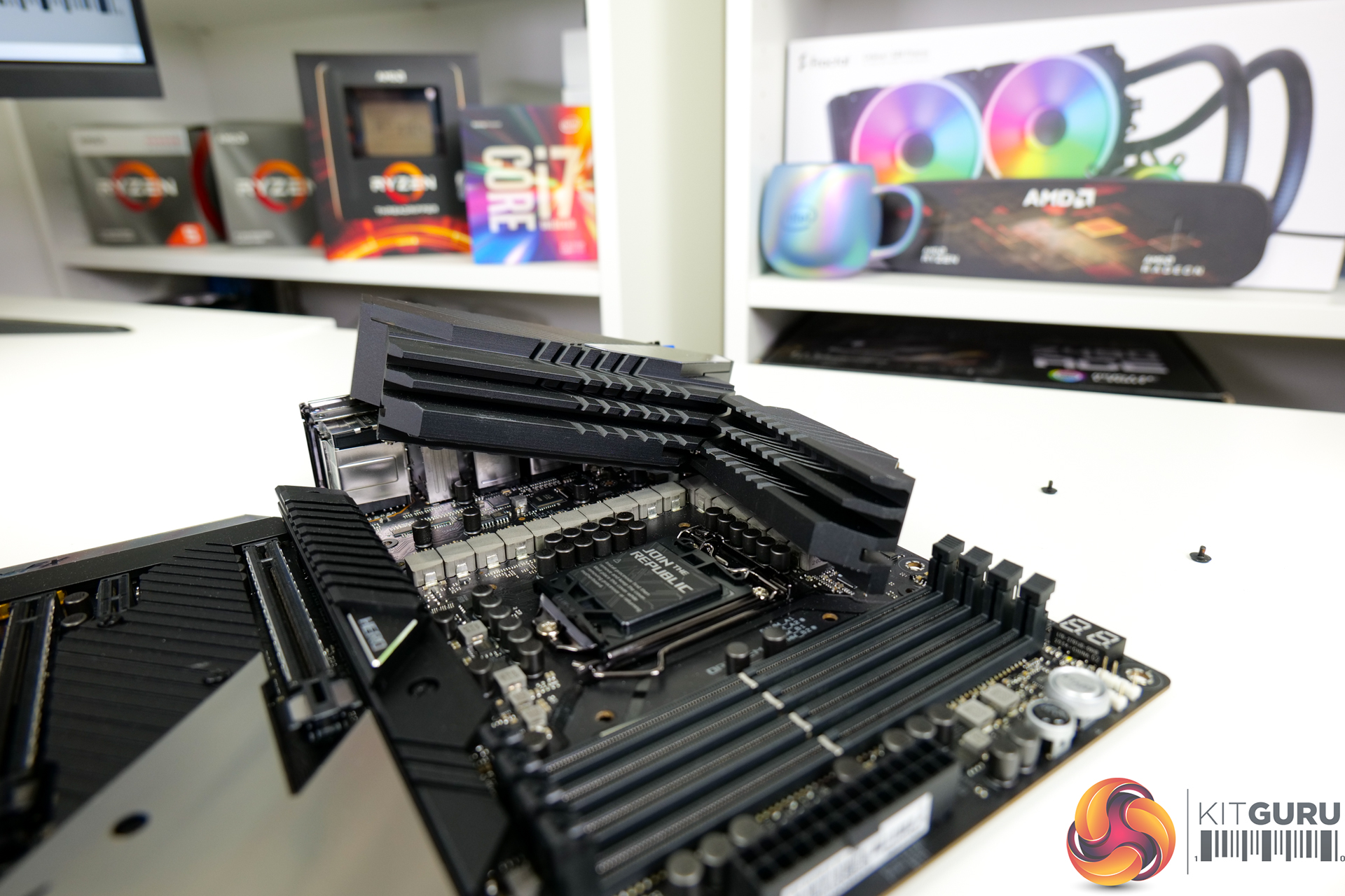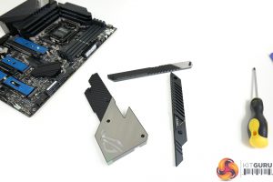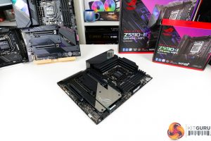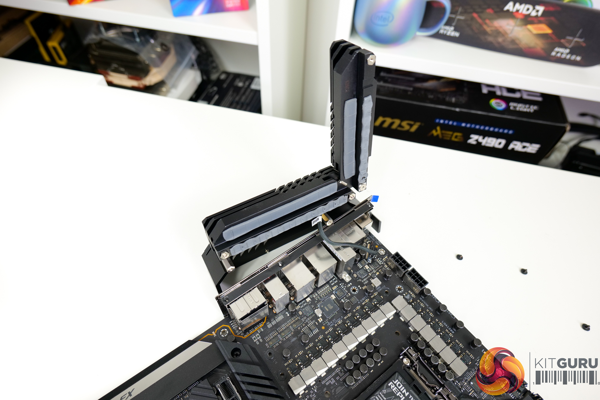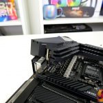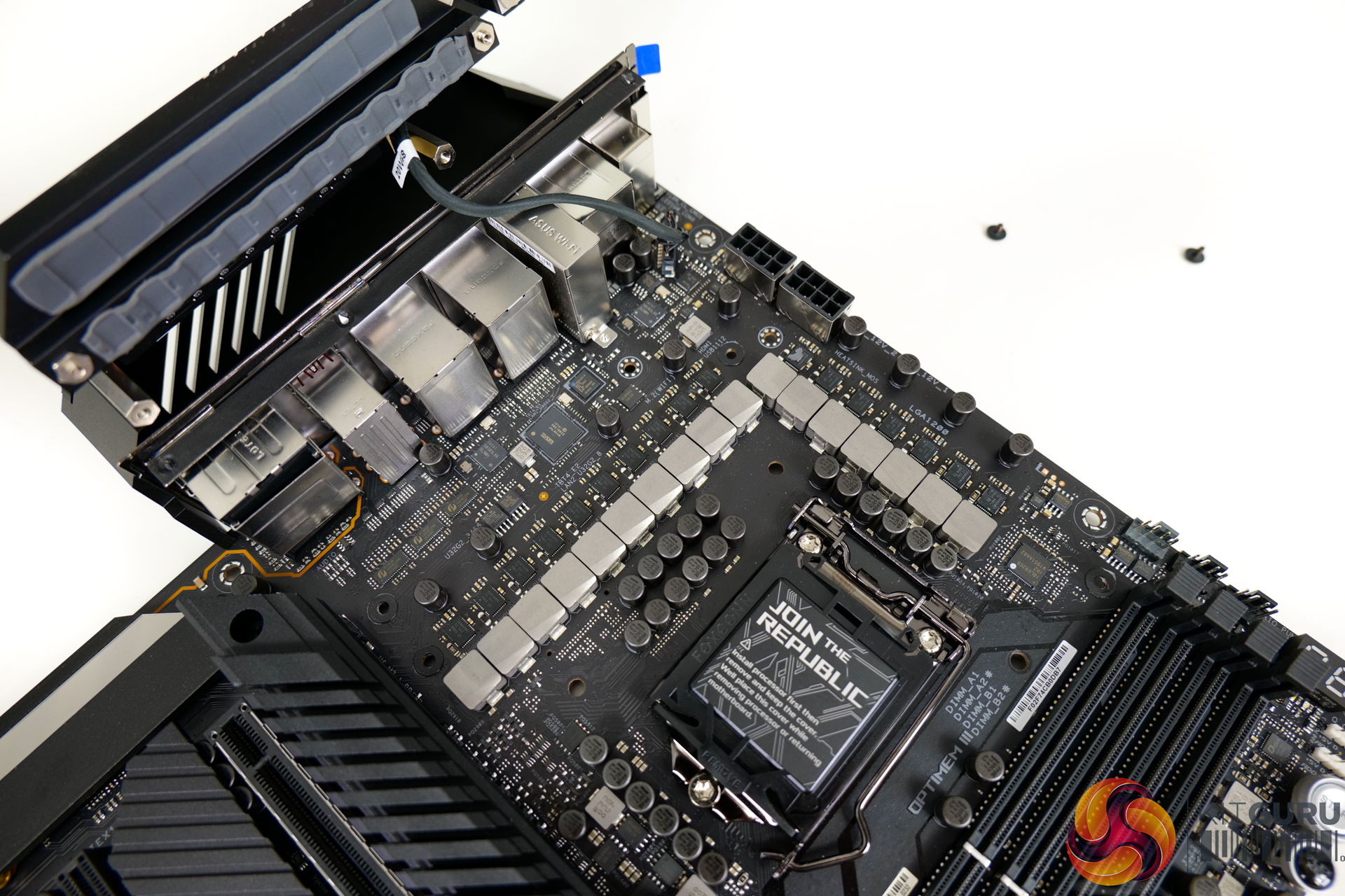 The VRM heatsink is gargantuan and is even bigger and beefier than the Z590-E Gaming WiFi’s block. Again, we get multi-tiered slabs of metal connected via heatpipe. And the left-side heatsink still extended as the rear IO cover and RGB housing. ASUS’ effort with the VRM heatsink design here is very impressive. And clearly ASUS has confidence in the implementation as there is no included fan or fan mount.