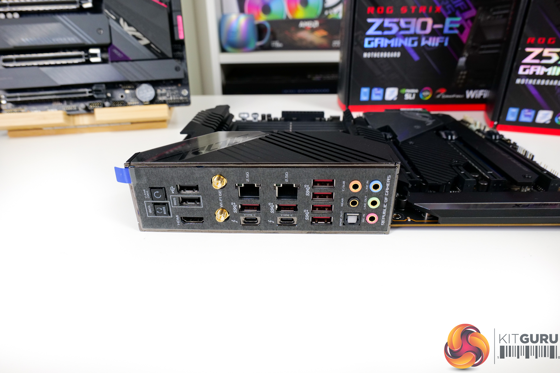 The Rear IO of the Hero is fantastic, once again offering an upgrade over the cheaper Z590-E Gaming WiFi. You get eight USB Type-A ports – 6x 10Gbps USB 3.2 Gen 2 and 2x old USB 2.0 ports including one which handles BIOS Flashback. Catering once again for enthusiasts, the Hero offers dual Thunderbolt 4 Type-C ports on the rear IO via an Intel JHL8540 controller. These are great inclusions if you have the need for TB4 connectivity as it is an area where the Intel platform currently makes sense versus AMD.