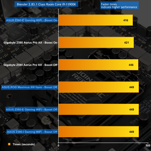 Looking at CPU-focussed performance in Blender, we see ASUS’ options scoring very closely to Gigabyte Z590 competitor that Leo tested. This is because the Core i9-11900K was running at the same nominal 4.7-4.8GHz clock speed. Applying Adaptive Boost increases performance beyond that of Gigabyte’s competitor.