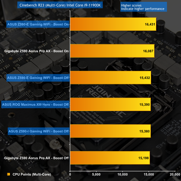 We see the same trend in Cinebench R23 whereby ASUS’ Z590 options score a little higher than the Gigabyte board that Leo tested when at stock. Adaptive Boost delivers a healthy performance gain for additional heat and power.