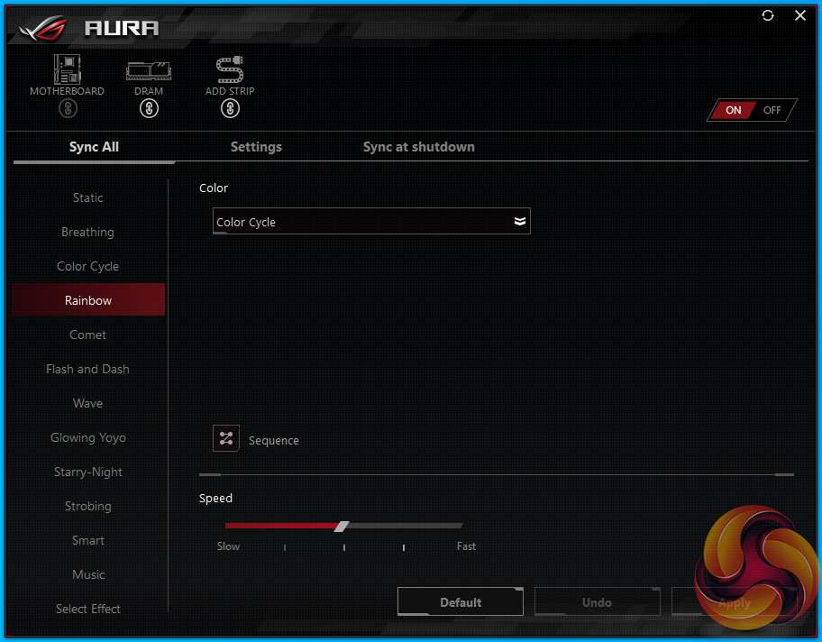 ASUS’ AURA RGB tool is a very comprehensive piece of software used for managing the colours and operating parameters of onboard and connected LEDs. LED operating modes can be synchronised with other compatible hardware or managed for the motherboard alone.