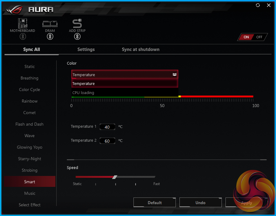 I particularly like the CPU temperature mode that changes the light colour based on processor thermals. The thresholds can be adjusted so that green stays present for longer or red is activated quicker. It was, however, noticeable how slow the LED colour would change when a load was applied. This is due to the lag in temperature readings through AI Suite 3 (the software tool that is used to drive AURA‘s temperature readings).