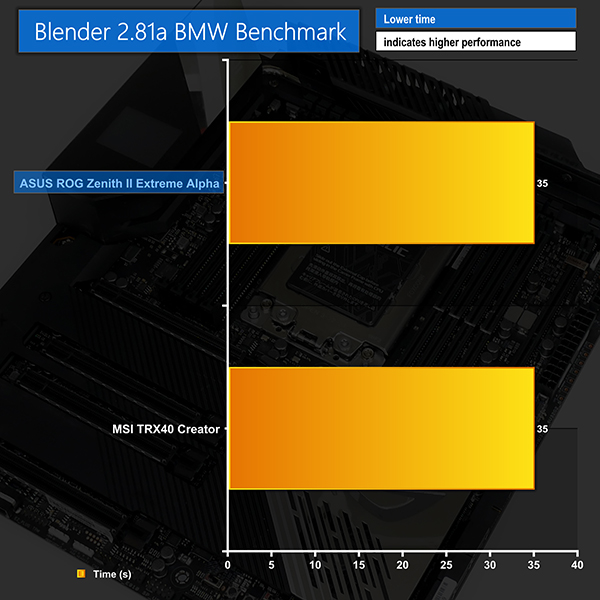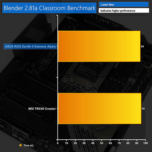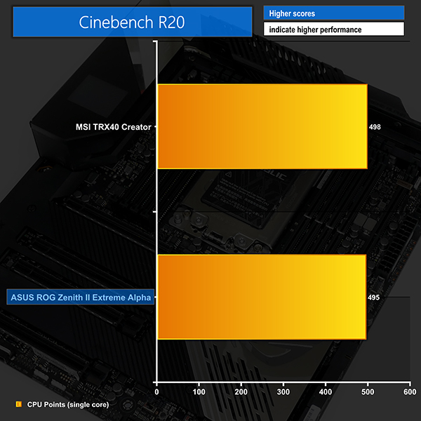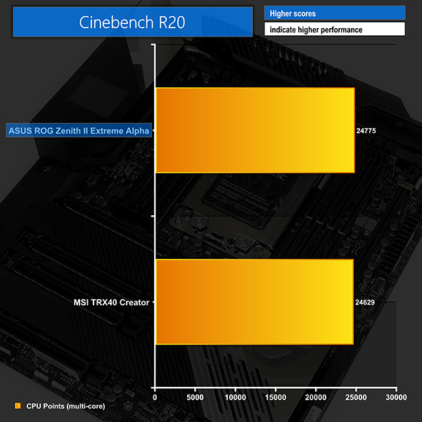 CPU-related performance from the ROG Zenith II Extreme Alpha is very competitive against MSI’s flagship TRX40 Creator. Cinebench is a little faster on the ASUS board for nT but is very slightly slower in 1T mode. Realistically, these numbers are close enough to call performance roughly a draw.