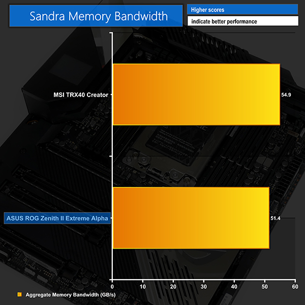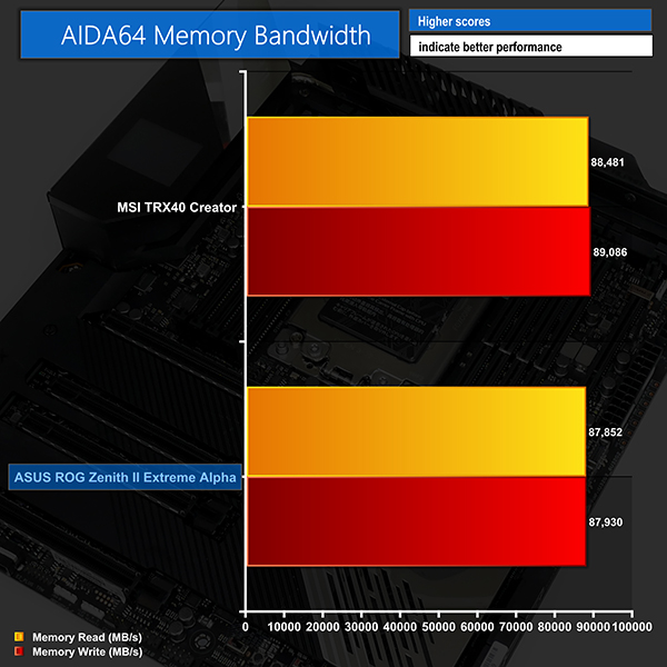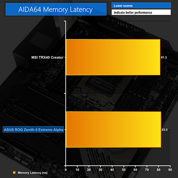 Memory bandwidth numbers shown by the ASUS ROG Zenith II Extreme Alpha are not as high as the figures from MSI’s competitor. That result holds true in both SiSoft Sandra and AIDA64 testing.