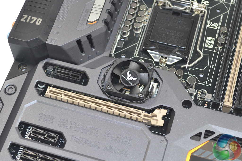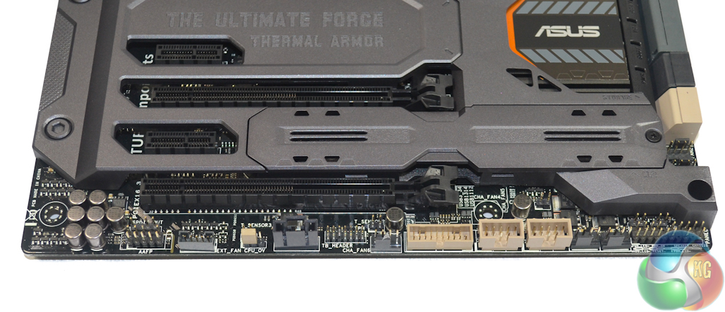 No less than a dozen fan headers are distributed around the board, however two of those are specifically allocated duties of controlling the supplied Thermal Armor fans. Asus' UEFI and OS software tools allow a good level of speed control. Nuvoton's NCT6793D and a TUF ICe chipsets manage fan control and monitoring duties.