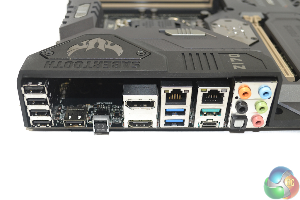 A stack of four USB 2.0 ports is useful for connecting low-bandwidth devices such as a mouse and keyboard. Next to that bank of connectors is the BIOS Flashback button. Some users may be disappointed to see a PS/2 header omitted as it can be useful for troubleshooting measures (especially when using the Z170 chipset with Windows 7).