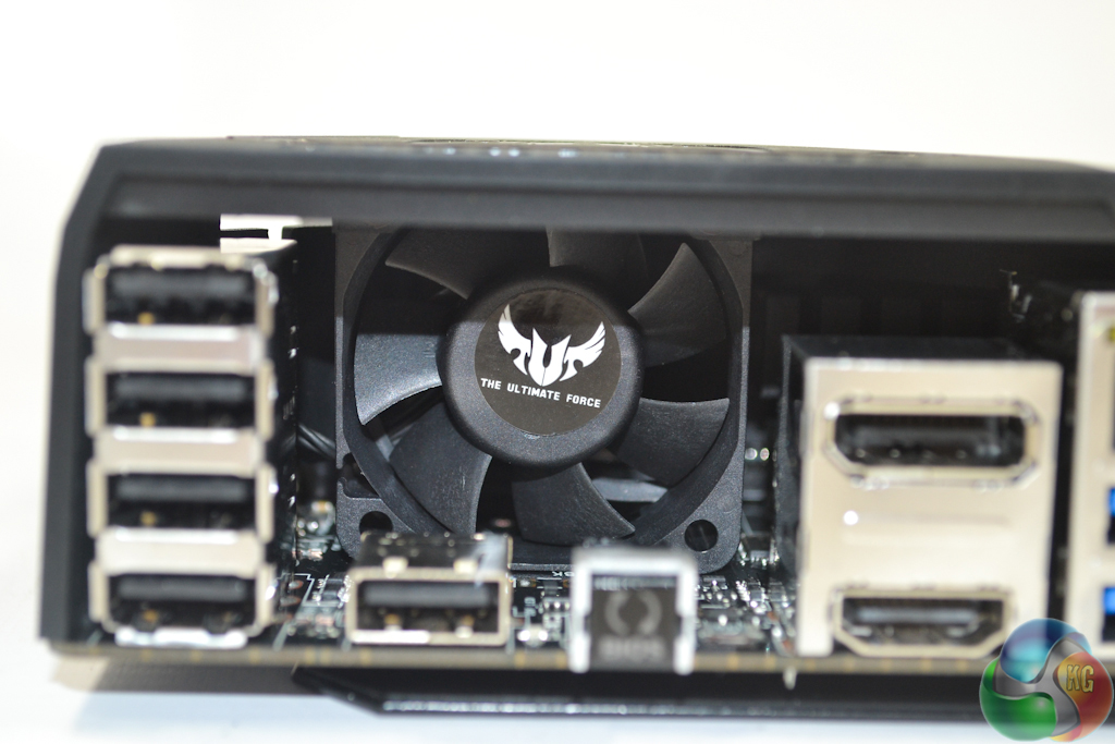The 35mm fan positioned below the CPU socket will feed (relatively) cool air beneath the plastic cover leading for the heat-absorbing coolant to flow down towards the lower board section, away from the primary temperature-sensitive expansion cards. The 40mm fan mounted in the rear IO section pulls clean air into a dedicated area that is used to cool the motherboard's VRM components.