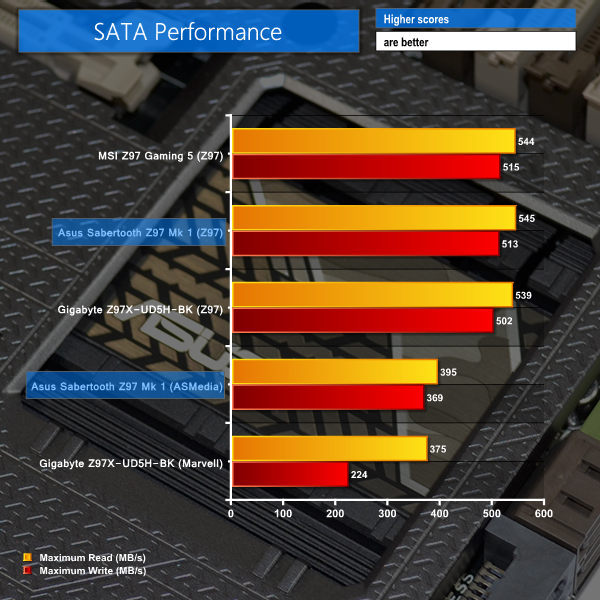 Z97 SATA performance on the Sabertooth Z97 Mark 1 is limitless for a modern SATA 6Gbps SSD. The pair of ports provided by ASMedia's ASM1061 chipset are significantly slower than the Z97 connections, although they're also considerably faster than Gigabyte's Marvell choices.