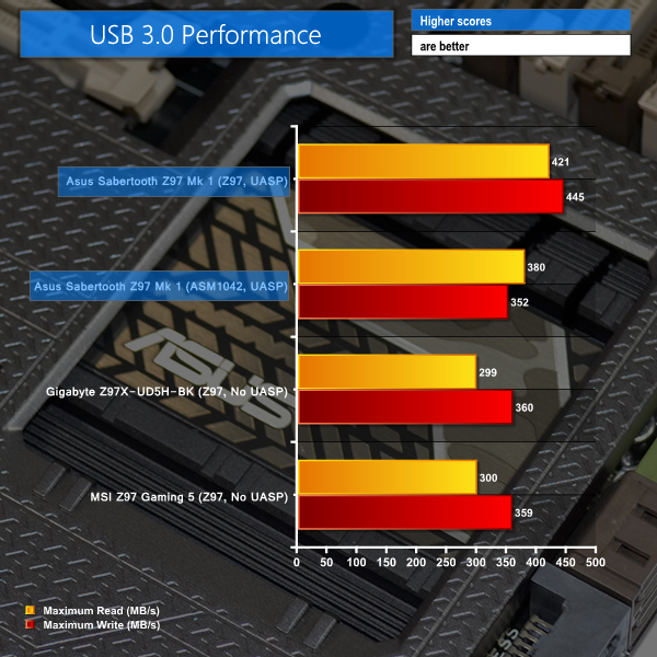 USB 3.0 performance is where Asus' board really shines. Being the only vendor in today's chart to offer a UASP-activating software tool for our Windows 7-based test system, the Sabertooth Z97 Mark 1 tops the USB 3.0 speed chart by a considerable margin.