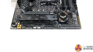Dual M.2 slots are deployed on the TUF Gaming B550M-Plus (Wi-Fi). The top slot is limited to 80mm drives and the bottom can take 110mm long SSDs.