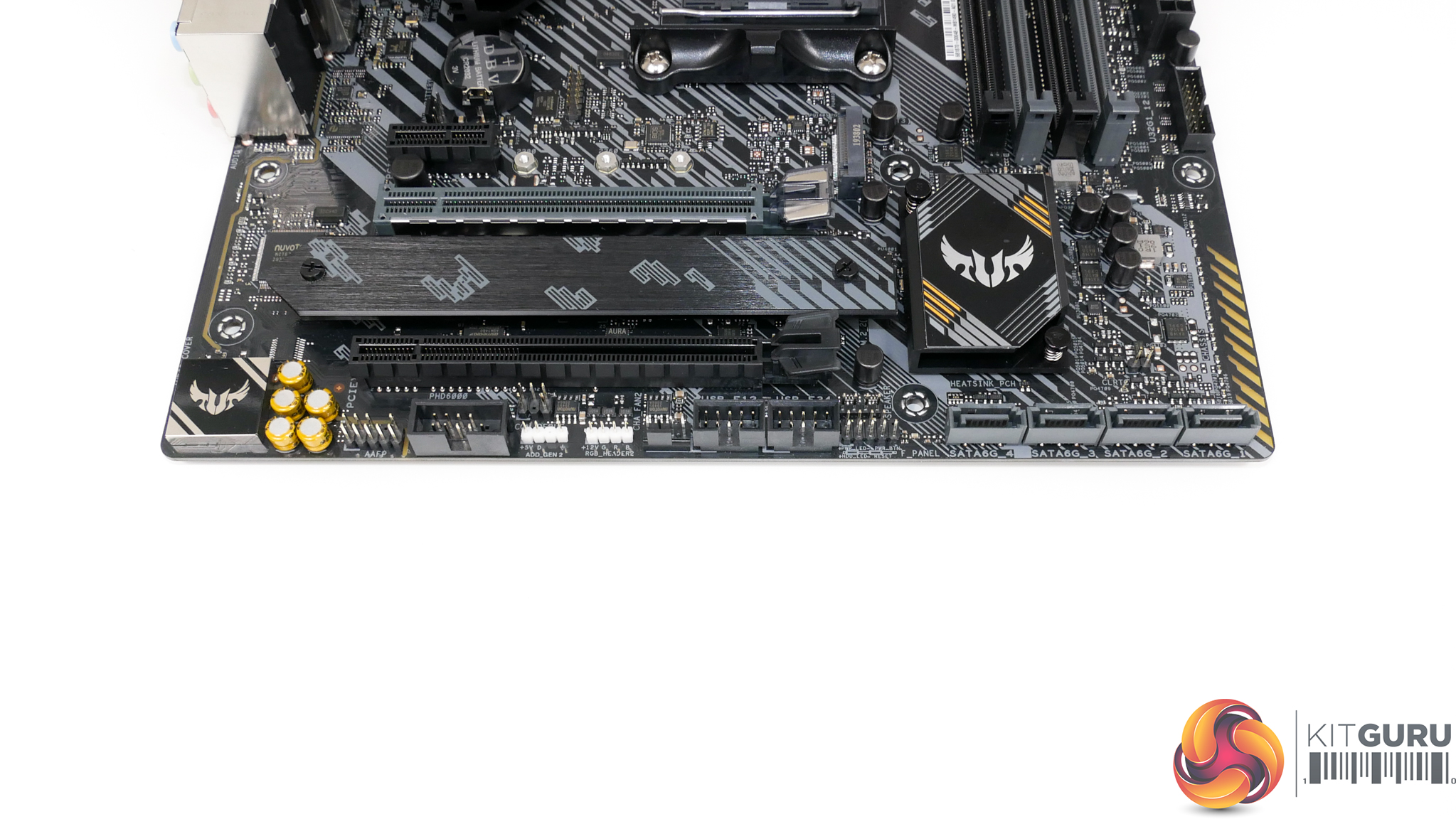 Two USB 2.0 headers is ideal for use with smart AIO and RGB kits. ASUS also deploys two RGB headers on the bottom edge, one of which is 3-pin addressable and the other is 4-pin 12V. The front IO header is more central than usual, which is not ideal for cable management but is not a particularly big deal.