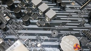 Two more Vishay SiC639 50A power stages are reserved for the SoC. This is perfectly capable and overkill for the SoC power delivery. Spacing between the power stages and inductors and their neighbours should help cooling by not locally saturating the PCB with heat. This is a small touch but a smart one. ASUS uses 5K-rated MIL capacitors which are high quality components.