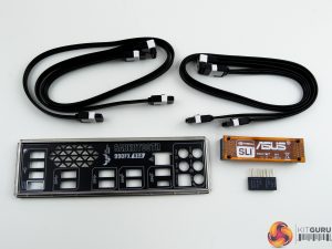 Four SATA cables, the rear IO shield with a vented section, ASUS’ Q-connector block, and an SLI bridge form the accessory bundle. Disappointingly, the SLI bridge is an ugly brown colour that could quickly destroy the aesthetic appeal of a system build.