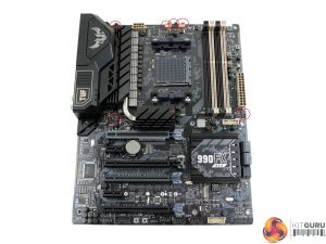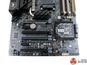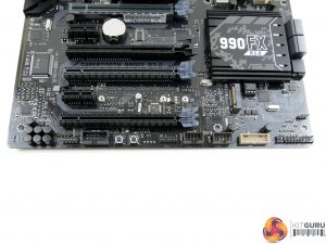 A rear IO cover serves two purposes – blocking out the ugly rear ports and acting as a mounting location for a small rear fan that can be used to cool the VRM components. A heatsink on the board’s rear side cools additional components relating to the power delivery system. A healthy quota of PCIe lanes from the 990FX Northbridge means that a pair of electrical x16 slots are wired alongside two x8 links (one of which is limited to x4 usage).