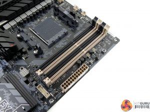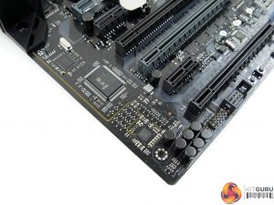 Up to 32GB of DDR3 memory can be installed in the four DIMM slots. ASUS quotes support for dual-channel DDR3 at up to 1866MHz frequency but we used 2400MHz RAM without problems thanks to the high divider in ASUS’ UEFI. A Digi+ ASP1103 chip manages power for the memory.