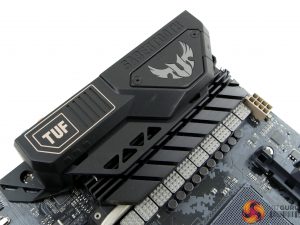 A TUF-branded cover can be used to install a 40mm fan next to the VRM heatsink. The fan can be set as a rear intake to force cool air directly over the hard-pushed VRM heatsink when a heavy overclock is applied.