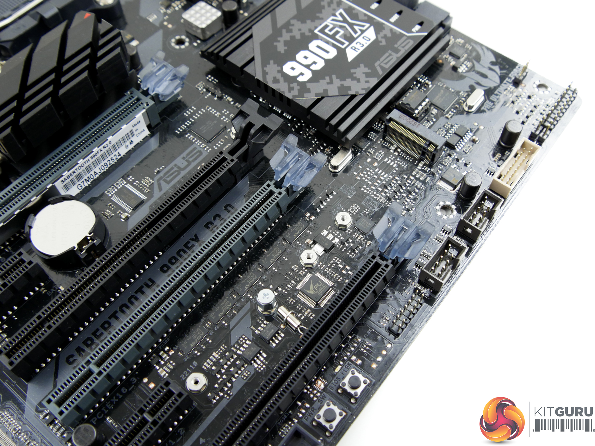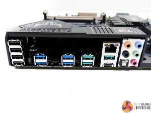 An additional 5Gbps front panel USB 3.0 header is mounted on the bottom of the board, provided by an ASMedia ASM1074 hub chipset that shares its bandwidth with the other internal USB 3.0 header. Power and BIOS Flashback buttons are also found on the bottom edge.