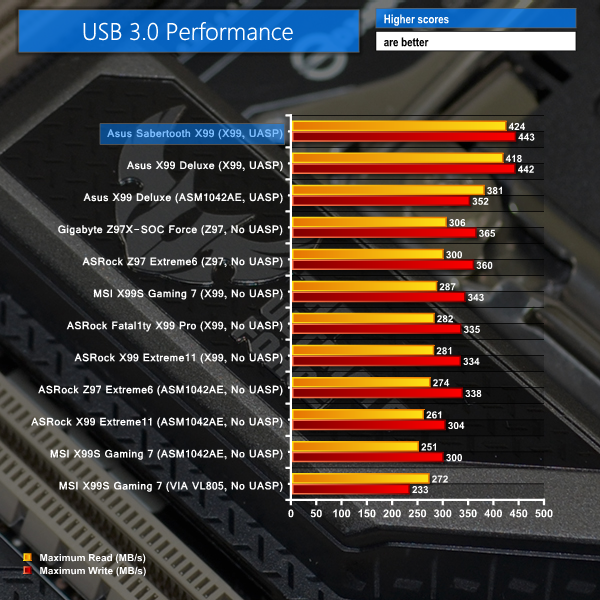 Windows 8.1 users will see little performance difference between any of the X99-fed USB 3.0 ports on competing motherboards, thanks to the Operating System's built-in UASP driver.