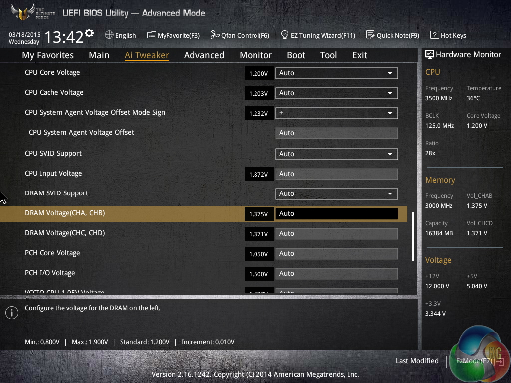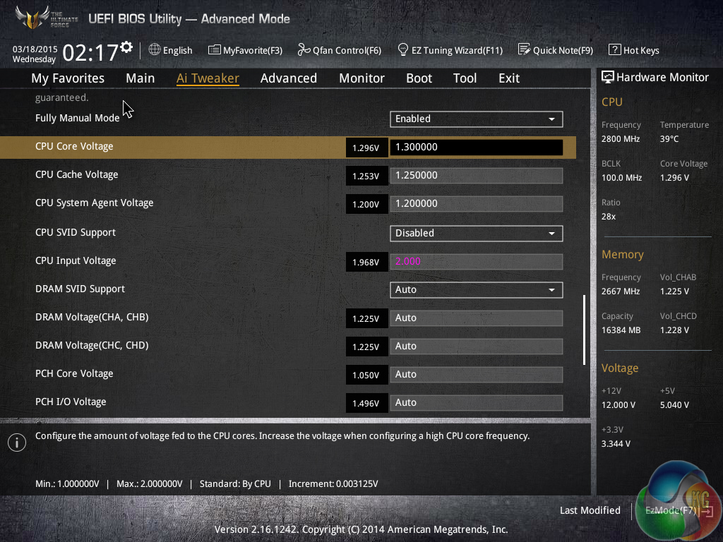 We have found Asus' motherboards to be a little picky with voltage settings in the past, and the Sabertooth X99 was no different. Some of the Auto settings are not suitable when other parameters are changed – for example we had to manually apply a 1.20V SA voltage in order to bring it above the 0.872V Auto level which gave instability with 2666MHz memory.