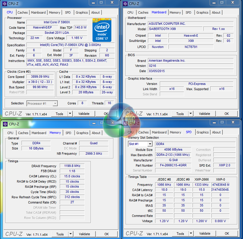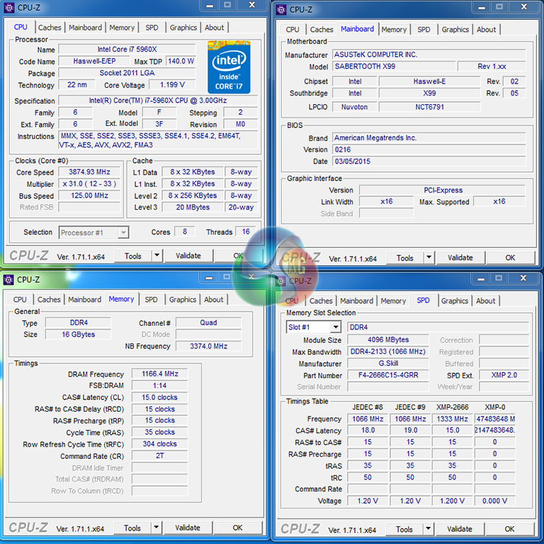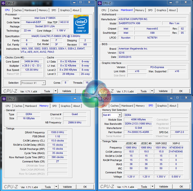 Asus' TUF Sabertooth X99 was able to load the 3GHz XMP settings for our G.Skill Ripjaws4 memory without hesitation. Despite the BCLK increase, CPU core and cache multipliers were automatically adjusted to bring the settings back to their MCT level of 3.5GHz and 3GHz, respectively.