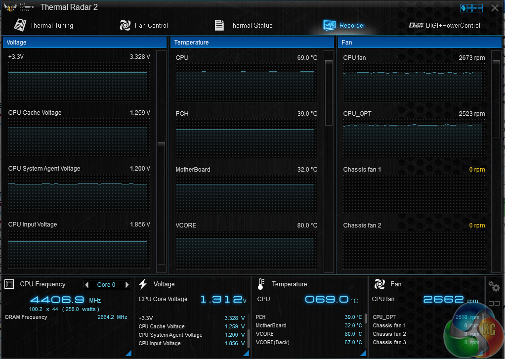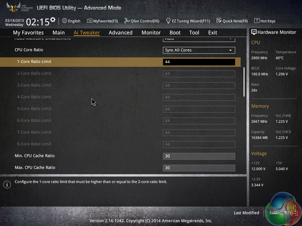 We managed to hit our 5960X chip's frequency limit of 4.4GHz with the Sabertooth X99, albeit with a little more effort than usual. Similar to what we observed with the X99-Deluxe, though, a 2.0V CPU Input Voltage (due to ~140mV drop when loaded) and 1.20V SA voltage (due to poor Auto settings) were critical to providing complete stability.