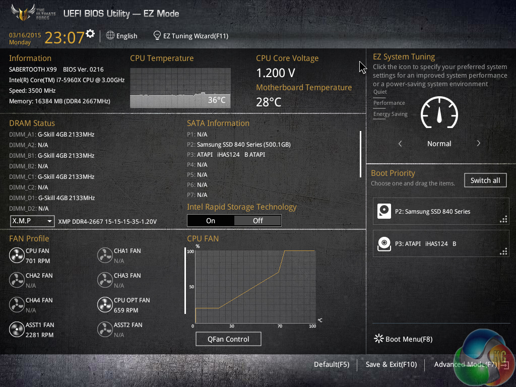 The UEFI used for Asus' TUF Sabertooth X99 motherboard is largely identical to the implementation used on its other X99 motherboards. Differences derive from the TUF part's enhanced thermal control options.