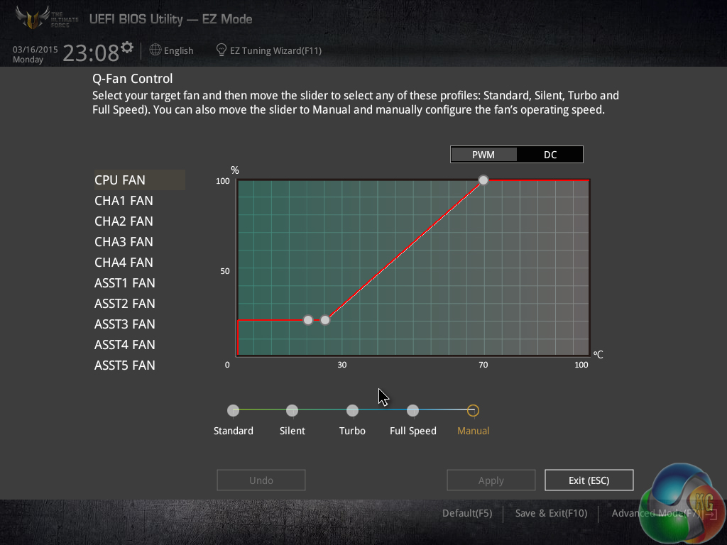 While Q-Fan is an easy, yet effective, method of creating custom fan profiles, its limitation to a minimum fan speed of 20% is disappointing. I would prefer the ability to completely shut off a fan under certain temperature levels.