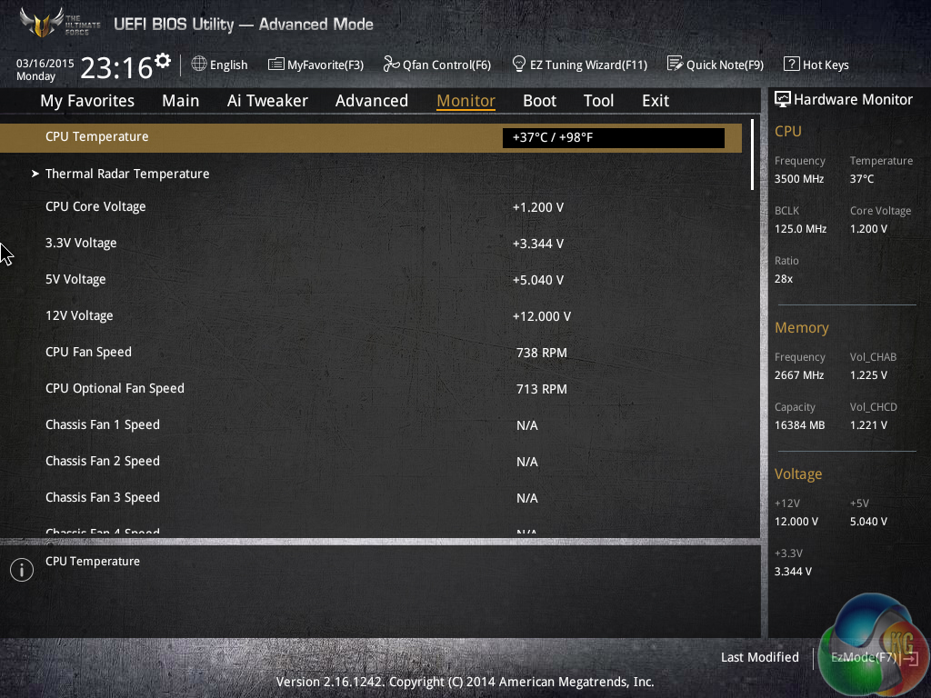 Asus opens its X99 UEFI with a summary page, of sorts, that squeezes a significant proportion of the important information onto a single 1024×768 screen.