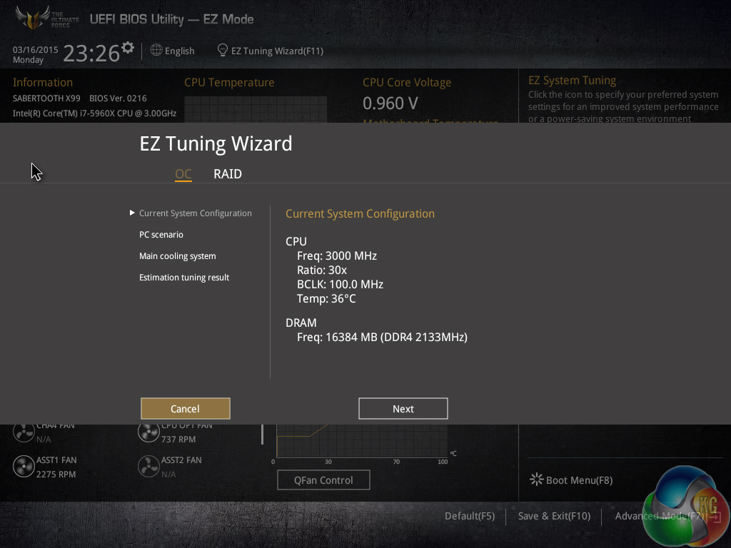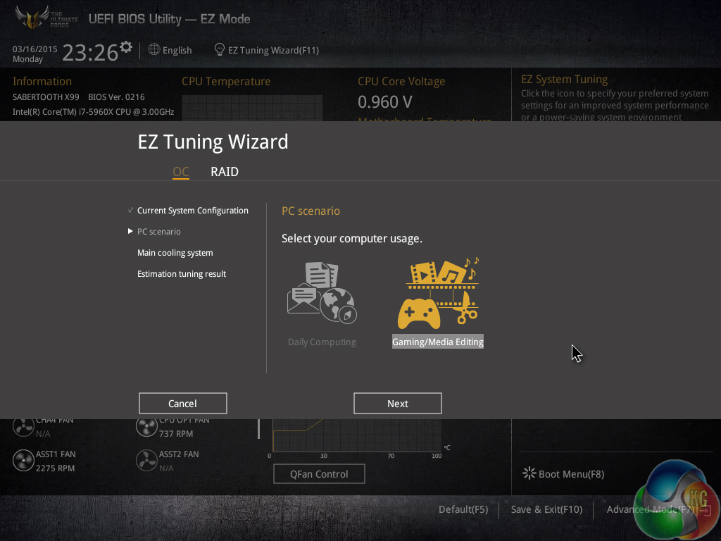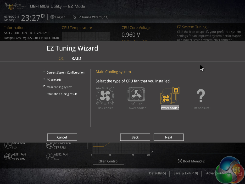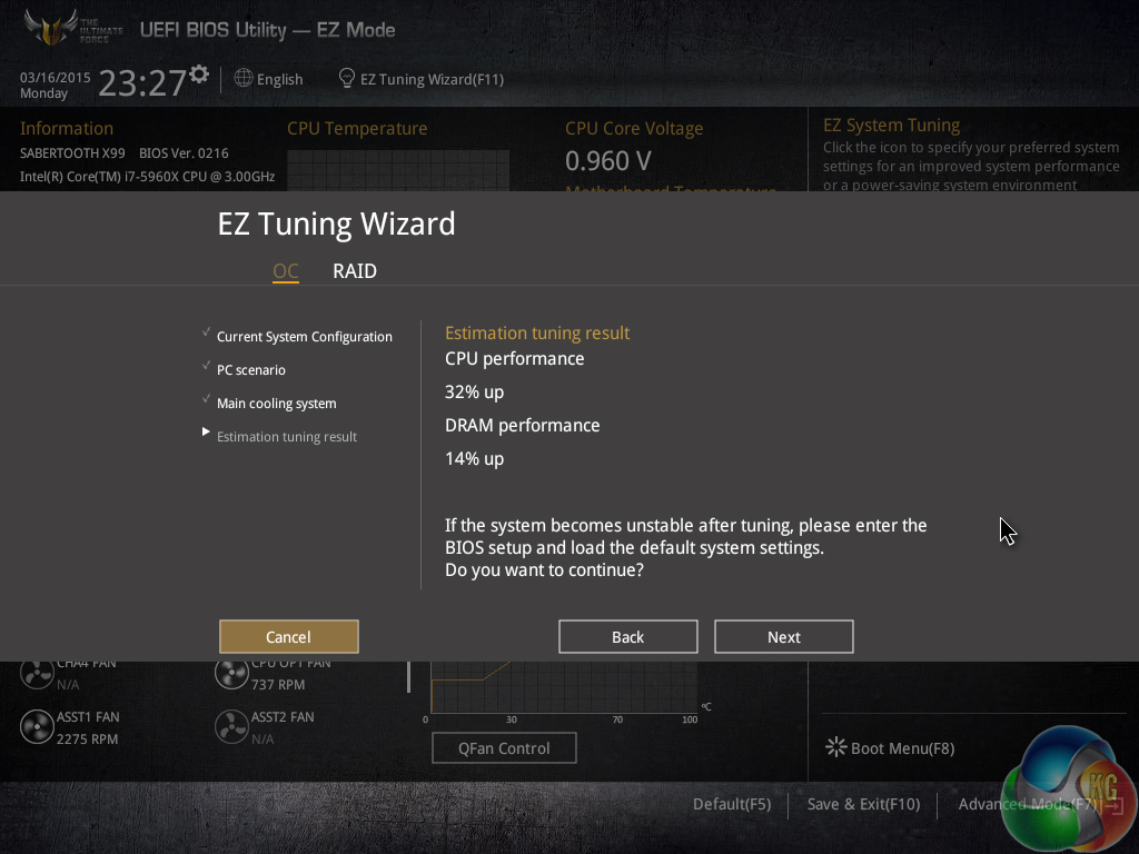 EZ Tuning automatically detects the installed components before allowing a user to select their system usage scenarios and cooling hardware. Once this has been processed, the wizard outputs a suggested DRAM and CPU frequency boost that can be achieved.