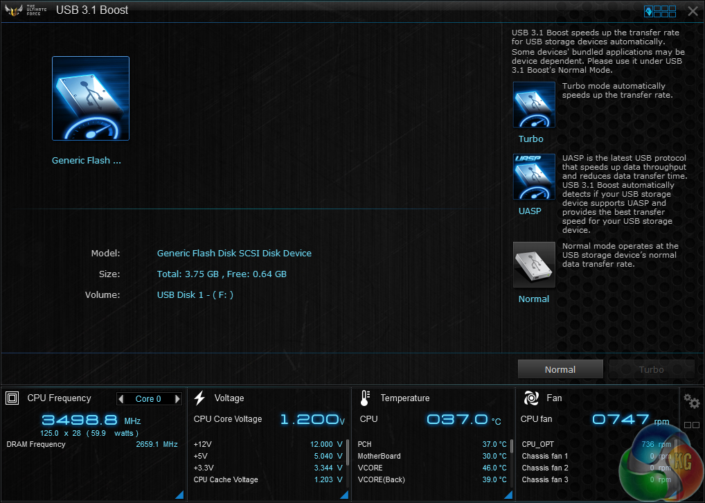 Focusing on the USB 3.0 element of USB 3.1 Boost, the tool is Asus’ way of enabling the speed-increasing UASP mode for USB devices connected to a Windows 7 system. Since ASRock dropped its UASP-activating software (XFast USB) back with Z97′s introduction, Asus’ USB 3.1 Boost tool is the only way of pushing past 400MBps with a USB 3.0 device connected to a Windows 7 system.