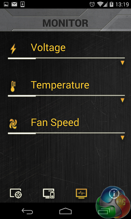 Voltage, temperature, and fan speed monitoring is given its own section in the app. Each of the sections features a clickable arrow that opens up additional information.