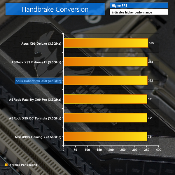 Positive performance results are displayed by the TUF X99 motherboard in Cinebench and our Handbrake conversion test. Both results show the Sabertooth X99 pushing hard to compete for top position.
