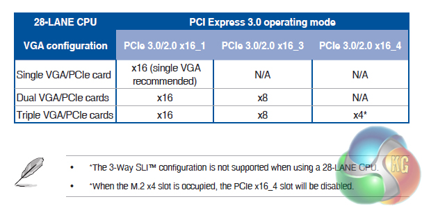 So, with a 28-lane CPU, you’re limited to M.2 PCIe 3.0 x4 plus 2-way SLI/CrossFire in a high-bandwidth link. Alternatively, you can run no M.2 connection and 3-card CrossFire using a less-than-ideal x4 link for the third card (the chipset-fed PCIe 2.0 port could be used for another x4 graphics link, but it’ll be performance-limiting).