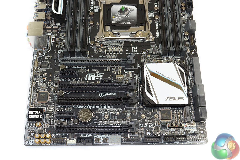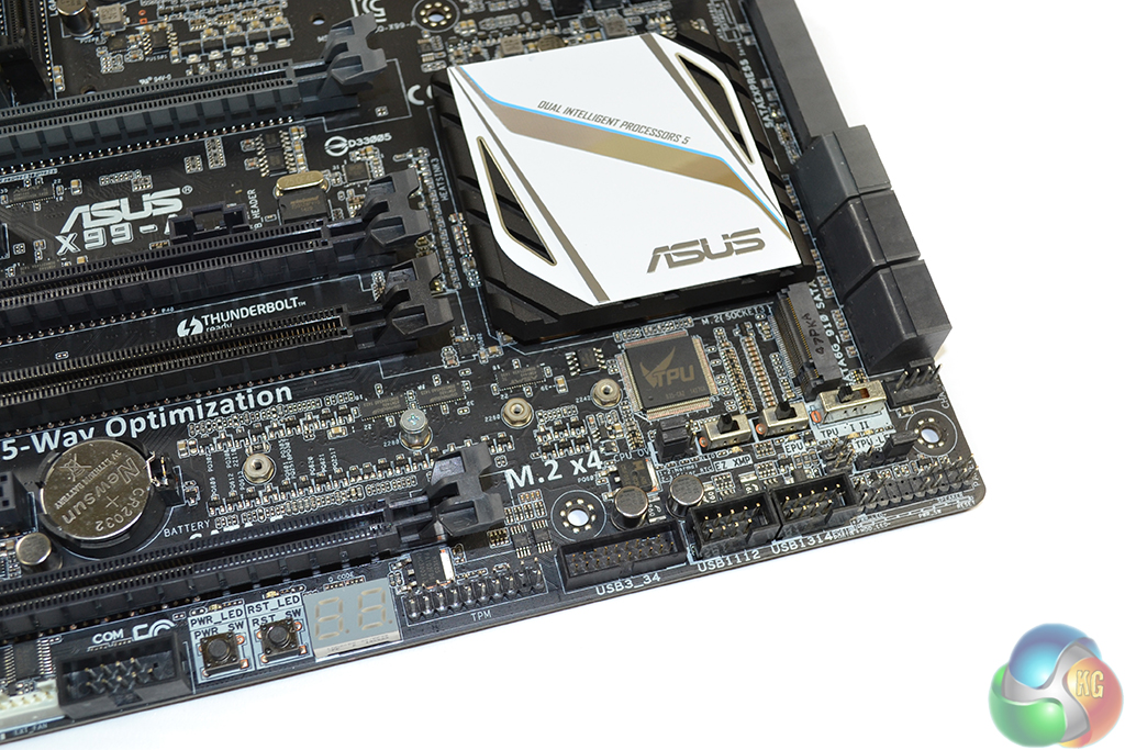 Asus sticks an additional USB 3.0 header along the bottom edge, providing an additional two ports from the X99 chipset. There’s also a convenient two-digit debug LED and power and reset buttons.