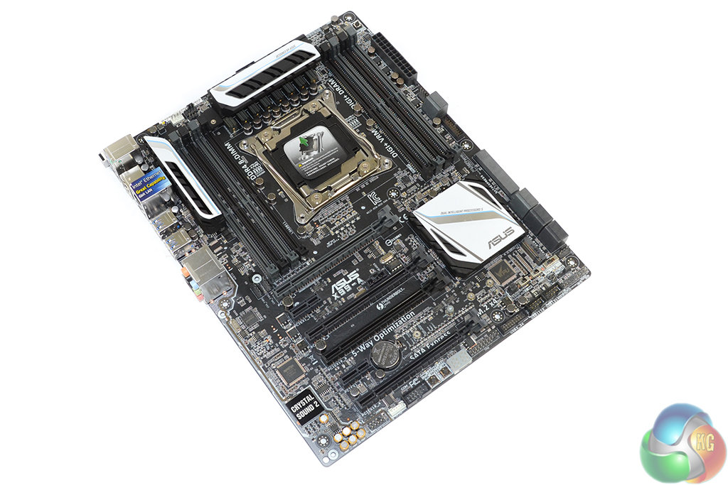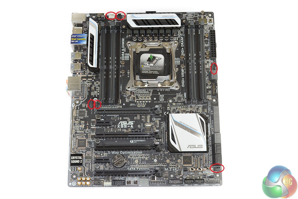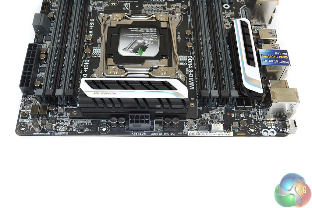 The large LGA 2011-3 CPU socket sits between two pairs of 4-DIMM banks. Asus’ OC Socket adds pins to the standard CPU socket in order to boost voltage delivery potential. The claims of higher CPU clocks can only really be tested with extreme voltage levels and cooling solutions; we have found very little difference between socket types at standard voltages.