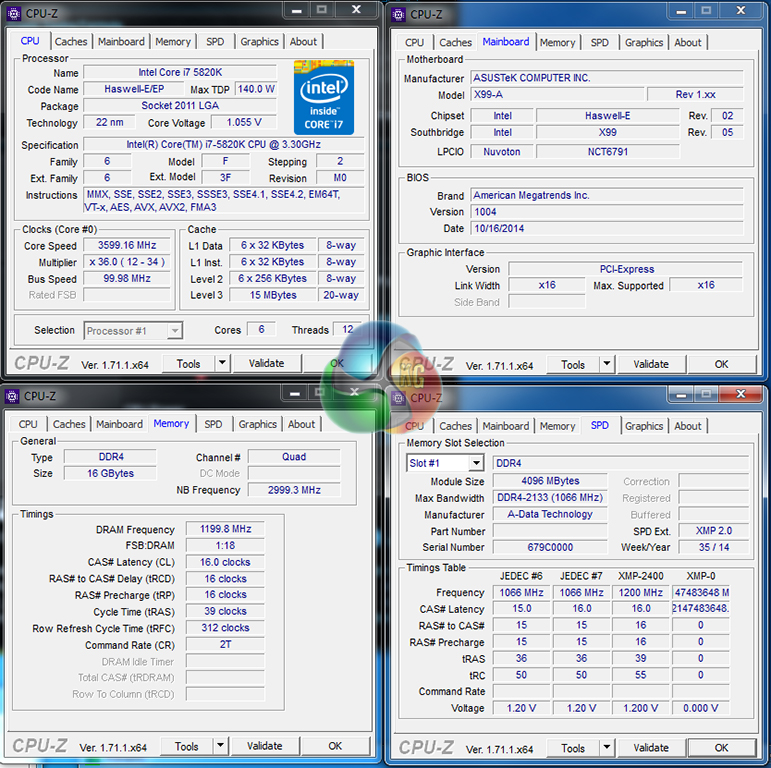 By default, the Asus X99-A motherboard applies multi-core turbo (MCT) and forces the 5820K to a constant 3.6GHz when XMP is enabled. This will be displayed as the ‘stock’ setting.