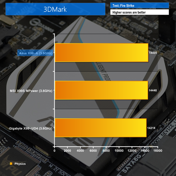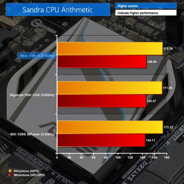 Asus' X99-A shows positive performance in the system-related 3DMark and Sandra benchmarks. A 3DMark physics score of 14,490 puts the X99-A firmly at the top of our performance chart. The same chart-leading performance is carried through to Sandra's processor arithmetic test.
