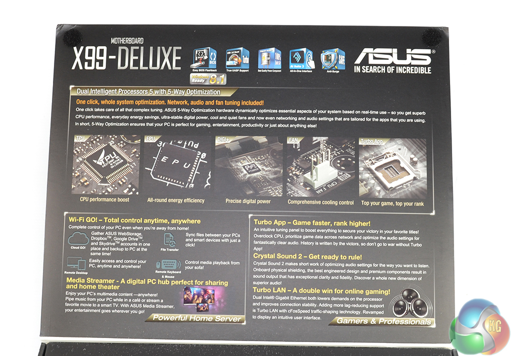 Asus ships the X99 Deluxe in the company's typical style of packaging. An image of the board, its name, and the outline of support for Asus' 5-way optimization engulf the front of the packaging.