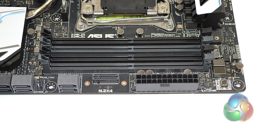 Up to 64GB of DDR4 memory can be installed in the eight DIMM slots. Asus quotes support for frequencies up to 3000MHz, although we have seen faster – up to 3333MHz – kits validated on some of the company's other boards.