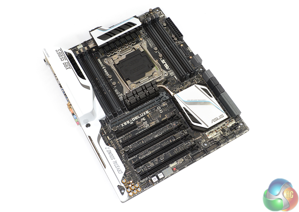 Don't be fooled by the physical provision of five full-length PCIe slots; Asus limits the simultaneous operation to three connections. With a 40-lane CPU, that’s real-world capacity for three-way SLI/CrossFire using dual-slot graphics cards with a x16/x16/x8 + x0 M.2 or x16/x8/x8 + x4 M.2 configuration. The use of a 28-lane CPU would drop all PCIe links down to eight lanes and keep bandwidth for the x4 M.2 connector.