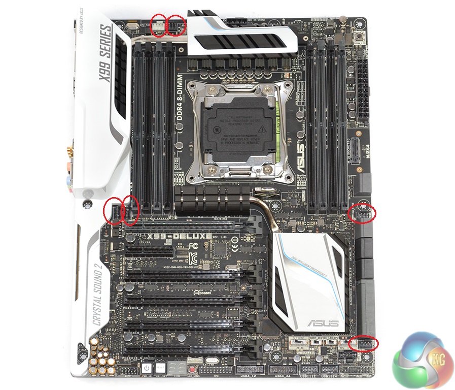 Six 4-pin fan headers are evenly distributed about the X99 Deluxe motherboard, five of which are accessible from the LGA 2011-v3 socket. We have no complaints about the headers' positioning, but if you do there's always Asus' fan extension card as a back-up.