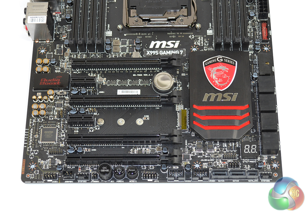 A PCIe 2.0 x4 slot is also present and runs from the X99 chipset’s lanes. Its function is to serve as a means of connecting lower bandwidth devices that make use of the older PCIe interface. ASMedia's ASM1187e controller is used to generate seven PCIe 2.0 x1 lanes from one single-lane input. Many of these lanes are fed to add-on storage chipsets from ASMedia.