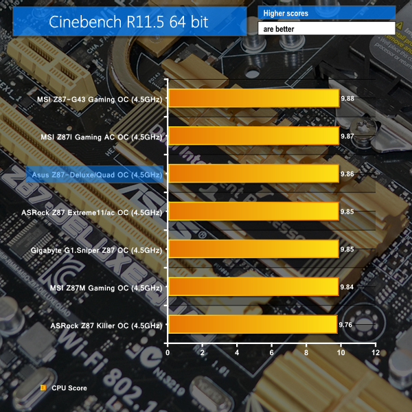 As a performance comparison, we have included the overclocked results from five other Z87 motherboards. The maximum overclocked configuration achieved with each board was a 4500MHz (45 x 100MHz) processor frequency and 2133MHz CL9 memory speed.