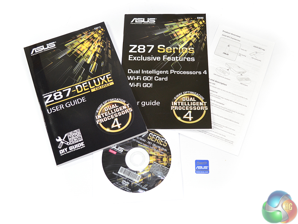 Asus includes documentation for the motherboard and some of its key features. A case badge is also provided.