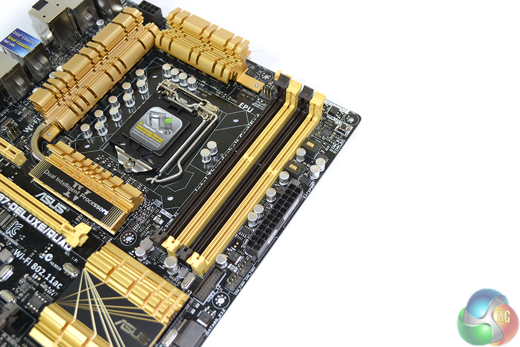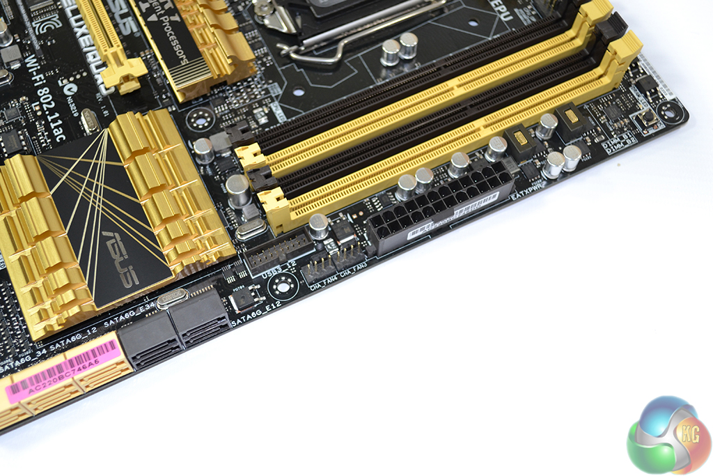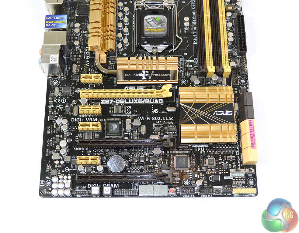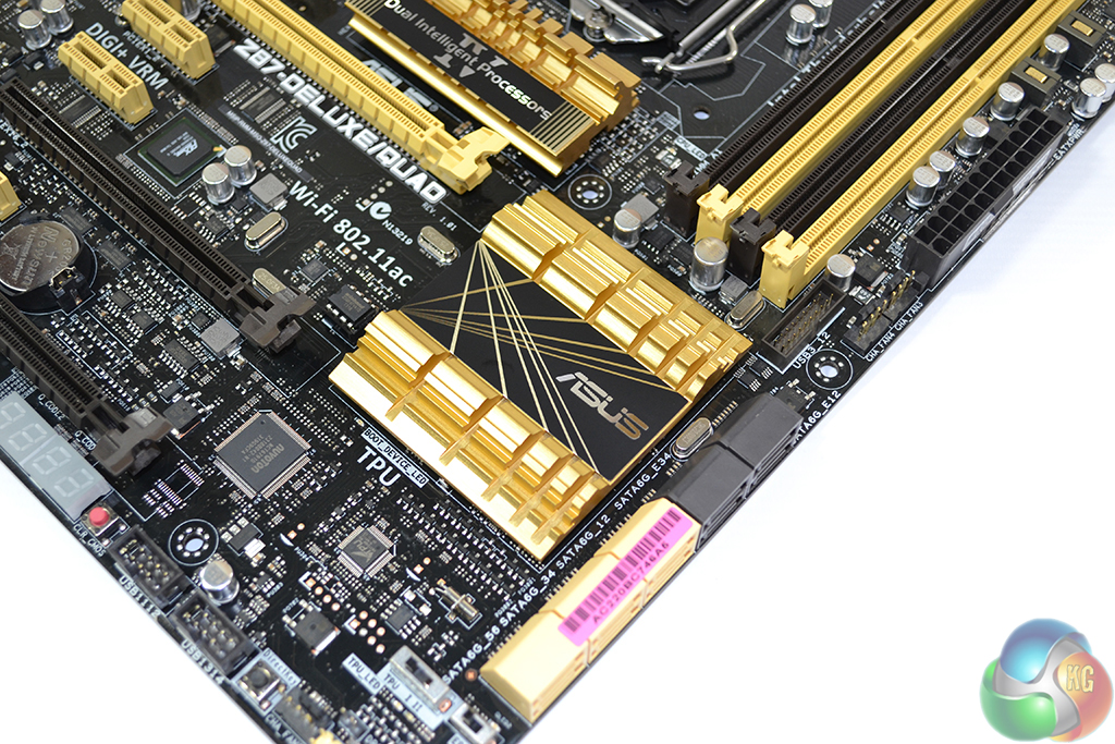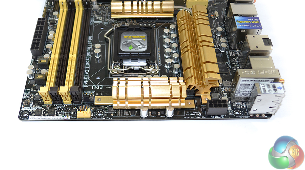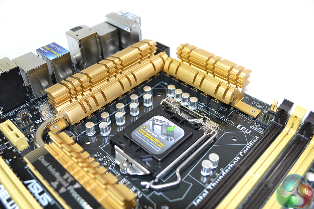 Asus uses stylish black and gold heatsinks to cool the sixteen phase VRM and Z87 chipset. The heatsinks are short enough to avoid major interference headaches.
