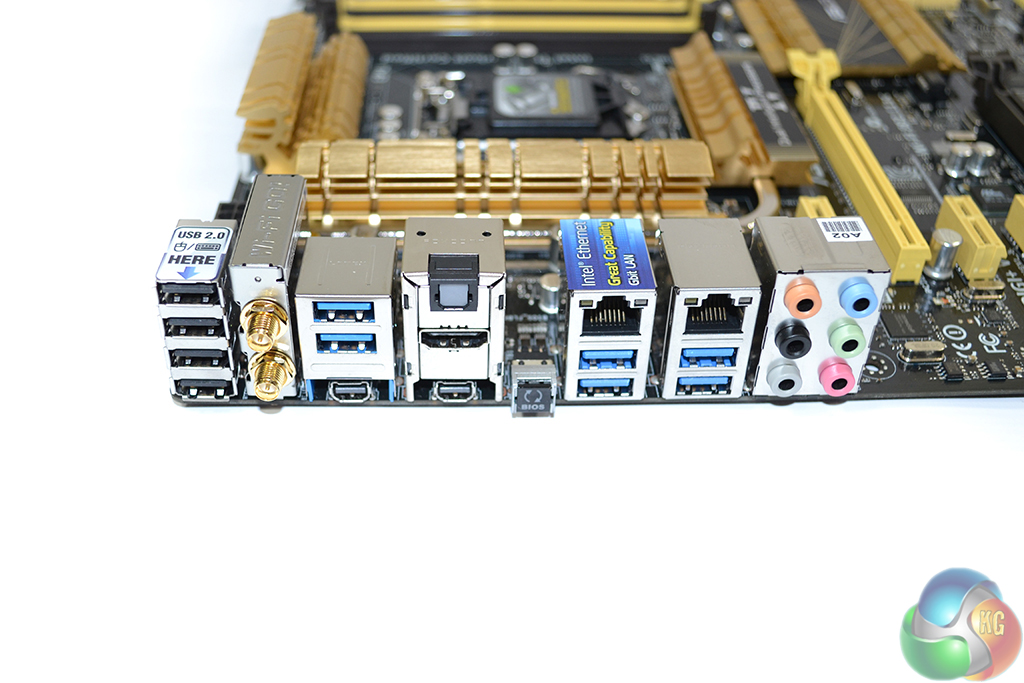 A pair of Gigabit Ethernet ports is provided by a combination of Intel's I217V chipset, as well as the RTL8111G from Realtek. Asus should make it easier for users to understand which Ethernet connection is fed by each controller. Antenna connections for the two-stream, dual-band 802.11ac WiFi are found amongst the rear IO ports.