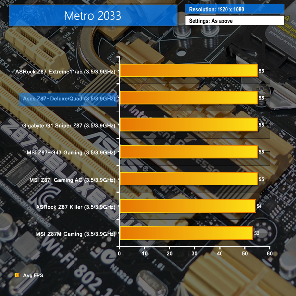 Gaming performance from the Asus Z87-Deluxe/Quad is solid. The motherboard managed to muster up a few extra frames over some of its Z87 counterparts. Asus's board also managed to vastly outperform the similarly professional user-orientated ASRock Z87 Extreme11/ac motherboard in gaming tasks.
